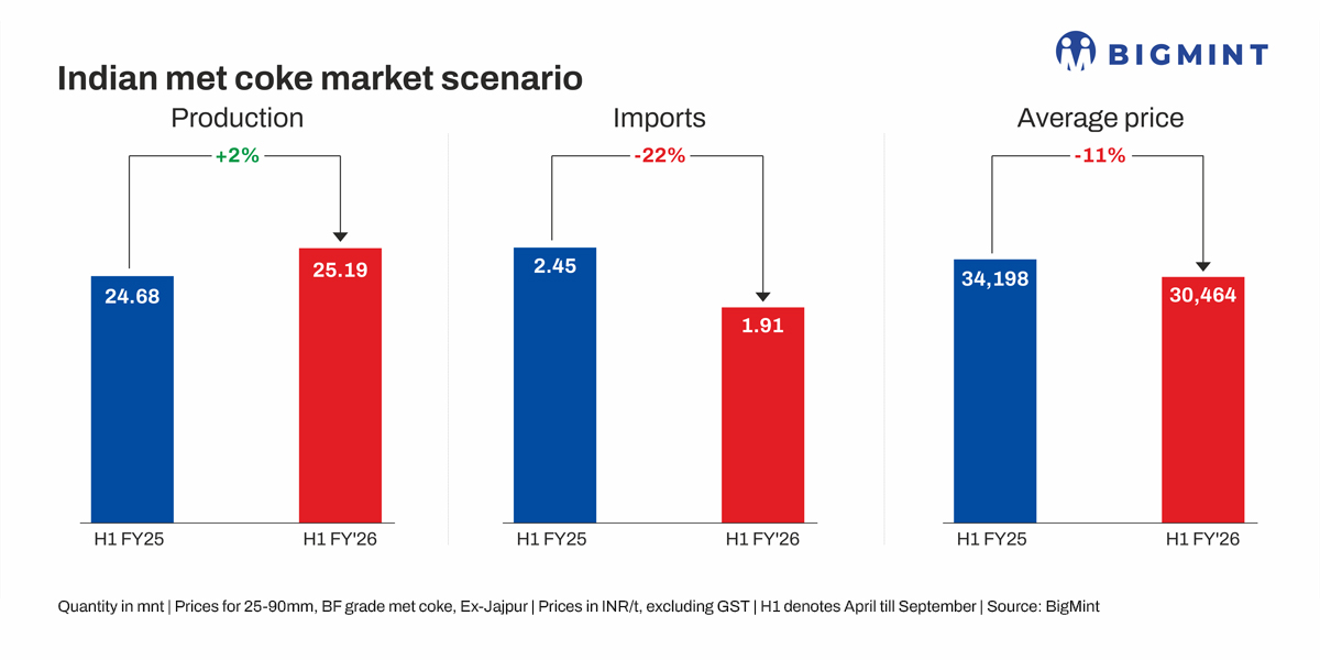Increase in coking coal imports: India’s coking coal imports in H1 increased to 33 mnt from 30 mnt in H1FY’25 due to the surge in hot metal production. Moreover, BigMint’s coking coal index, CNF India, started the fiscal year at around $204/t in April and has remained flat at around $206/t CNF Paradip in October. The absence of volatility and sharp price spikes in the coking coal market this year has paved the way for increased coking coal imports and, by extension, lower imports of met coke.