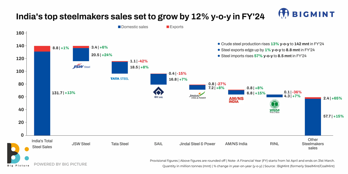 Morning Brief: The just-concluded financial year of 2023-24 (FY’24) proved to be a fairly good one for India’s steel industry. Provisional data compiled by BigMint reveals that India’s steel mills registered a 12% increase in their steel sales in FY’24 at 140.50 million tonnes (mnt) against 125 mnt seen in the previous fiscal (FY’23). Within this quantum, the share of tier-1 mills touched 80 mnt (73 mnt in FY’23), a 10% increase y-o-y. Tier-2 mills saw a 16% rise to 60 mnt (52 mnt).