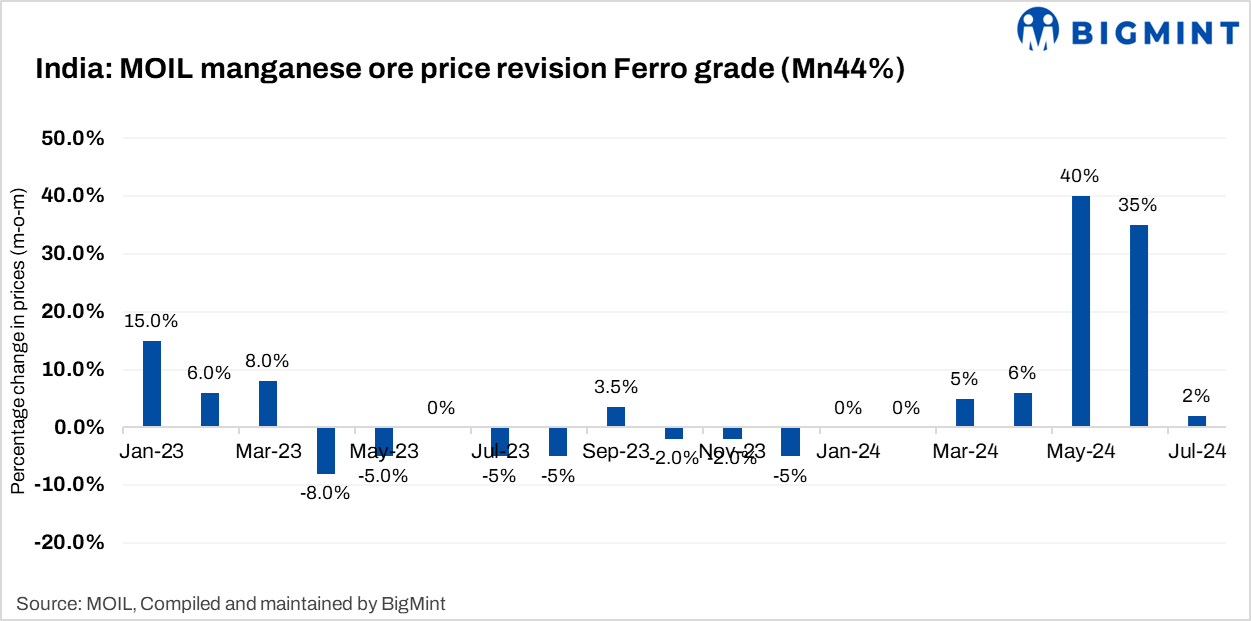 MOIL, India’s largest manganese ore producer, has announced manganese ore prices effective from 1 July 2024. Mn grades above 44% have witnessed a marginal hike of 2% in offers m-o-m, while lumps below 44% have decreased by 8% from last month’s offer , BigMint learnt from sources. Notably, this is the miner’s first price cut in the last six months after an increase in offers by around 40% last month and 35% in April.