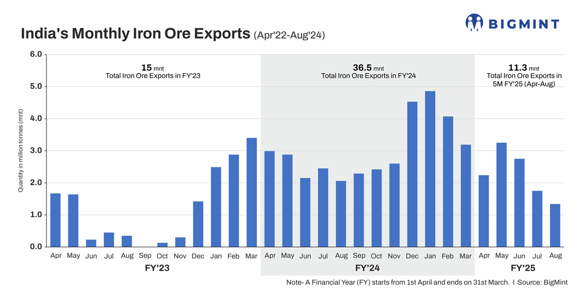 India’s exports of iron ore, excluding pellets, sunk to the lowest level in over one-and-a-half years in August 2024 to around 1.34 million tonnes (mnt), as per data available with BigMint. Such lows were last seen back in December 2022 when exports of iron ore were affected due to the imposition of a steep 50% duty on iron ore, which was revoked in November 2022. Exports declined 35% y-o-y in August, with all the major suppliers recording sharp decreases in shipments.
