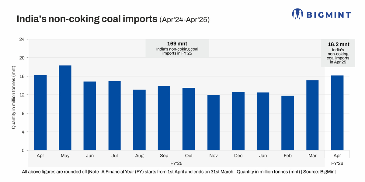 India’s imports of non-coking coal continued to climb higher in April 2025, largely due to seasonal factors, with total imports reaching around 16.16 mnt – the highest in 11 months, as per BigMint data. Imports rose by 7% m-o-m to 16.16 million tonnes (mnt) compared with 15.16 mnt in March. However, y-o-y, non-coking coal imports fell marginally by 0.5%.