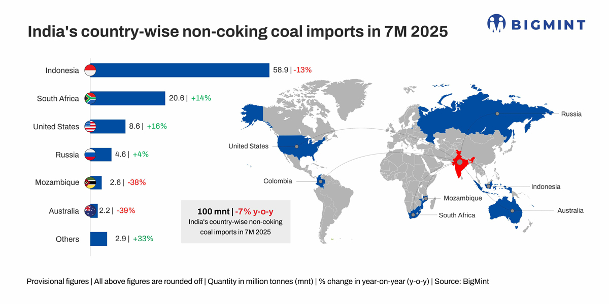 Morning Brief: India’s imports of non-coking coal, used for thermal power generation and in the industrial sector, declined to a 2-year low of 11.76 million tonnes (mnt) in July 2025, a drop of over 22% m-o-m and 21% y-o-y, as per latest data available with BigMint.
