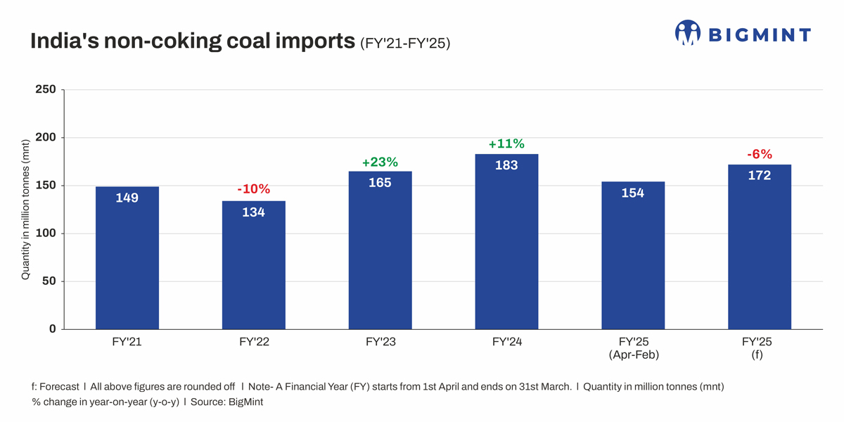 Morning Brief: India’s imports of non-coking coal, used in the power as well as industrial sectors, fell to the lowest level since November 2024 to around 12.2 million tonnes (mnt) in February, a decrease of 3% m-o-m, as per latest BigMint data.
