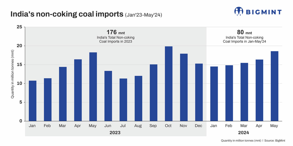 India’s imports of non-coking coal edged up by around 10% y-o-y in 2023 to close to 180 mnt, as India’s economic and infrastructural growth put increased burden on energy consumption and domestic resources. Over 80% of India’s thermal coal demand is for power generation. India’s current electricity generation mix constitutes coal (77%) followed by renewables (23%). India’s imports of non-coking coal, largely used in power generation as well as other industrial applications, increased by 12% y-o-y to nearly 80 million tonnes (mnt) in January-May 2024 compared to a little over 71 mnt in the same period of last year, as per data collated by BigMint.