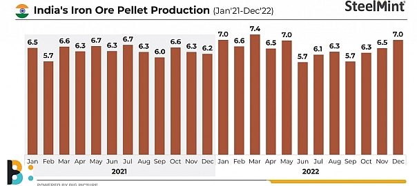 India’s iron ore pellet production in CY’22 stood at over 78.2 million tonnes (mnt), up marginally from 76.3 mnt recorded in CY’21, SteelMint data reveals. Production increased by around 2.5% y-o-y on the back of higher crude steel production due to increased domestic demand.