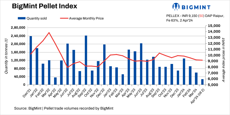 BigMint’s bi-weekly domestic pellet (Fe 63%) index inched down by INR 50/t ($0.5/t) to INR 9,150/t DAP ($108/t) Raipur on 2 April 2024 compared to the last assessment on 29 March. Around 28,000 t pellet (Fe 63/63.5%) deals were recorded at INR 9,250-9,350/t ($111-112/t) DAP Raipur in this publishing window after prices dropped by local pellet makers. According to sources, a Raipur pellet producer recorded around 50,000 t of higher grade pellet (Fe66%) deal at INR 10,700/t ($128/t) exw yesterday.
