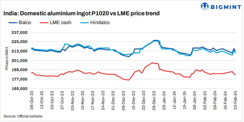 India’s primary aluminium producers have decreased ingot (P1020, 99.7%) prices by up to INR 3,000/t ($72/t). Post-revision, Balco’s prices are at INR 213,500/t ($2,575/t). Meanwhile, Hindalco’s prices are at INR 210,750/t ($2,542/t). All prices are ex-works and exclude GST.