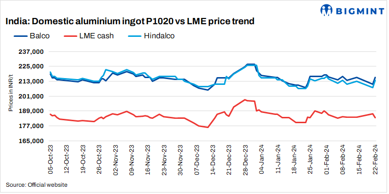 India’s primary aluminium producers have increased ingot (P1020, 99.7%) prices up to INR 6,000/t ($72/t). Post-revision, Balco’s prices are at INR 216,250/t ($2,609/t). Meanwhile, Hindalco’s prices are INR 213,750/t ($2,578/t). All prices are ex-works and exclude GST.