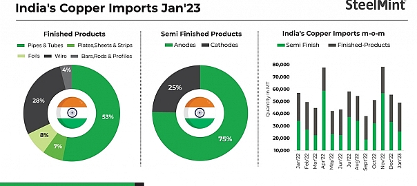 India’s import of semi-finished and finished copper products stood at 49,085 tonne (t) in January 2023, down from 55,516 t in December 2022, or 12% m-o-m.