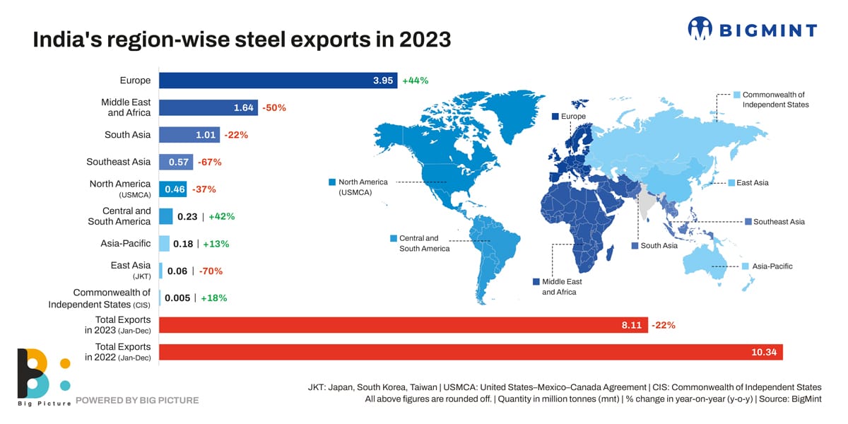 India’s steel exports in calendar 2023 (CY’23) were driven by the European Union (EU) which showed a substantial y-o-y growth. However, India’s overall volumes fell 22% in CY’23 to around 8 million tonnes (mnt) against 10 mnt in CY’22 because most of the other key importing geographies showed sharp y-o-y declines.