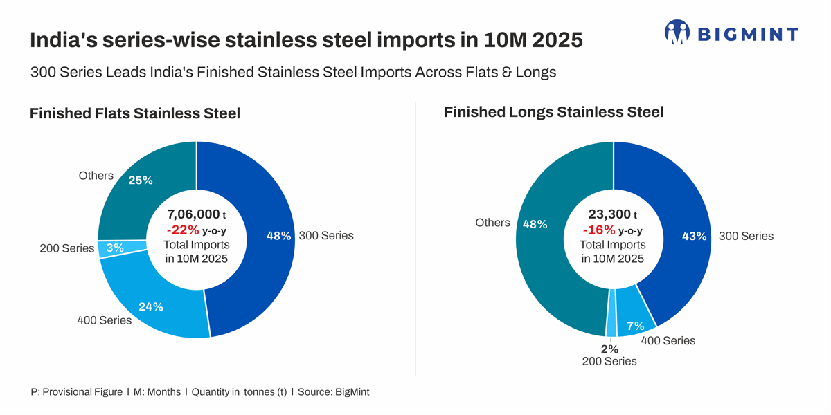 300-series flats imports grew 14% y-o-y to 0.33 mnt from 0.29 during the review period last year supported by steady demand from process industries and high-end applications. In contrast, 400-series imports fell sharply by 29% y-o-y to 0.17 mnt. 200-series flats remained relatively stable with a mild 3% decline at 20,000 t, while other grades corrected significantly due to shifts in sourcing patterns and reduced import dependency.