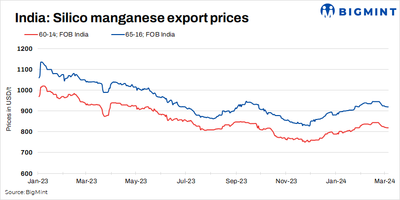 Silico manganese export prices dropped this week owing to surplus supply and limited demand from the overseas markets. According to BigMint’s assessment on 4 March 2024, the 60-14 grade was assessed at $820/t FOB, down $8/t, while 65-16 grade prices were at $920/t FOB, down $20/t.
