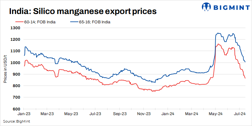 India’s silico manganese export prices fell by $51/t w-o-w on subdued demand from overseas. BigMint’s 15 July assessment revealed a significant decline in Indian silico manganese prices across grades. In fact, prices hit a three-month low. SiMn 65-16 fell by $45/t FOB to $1,005/t FOB, while SiMn 60-14 dropped by $57/t FOB to $865/t FOB (Haldia/Vizag). Data indicated a softening in the Indian silico manganese market.