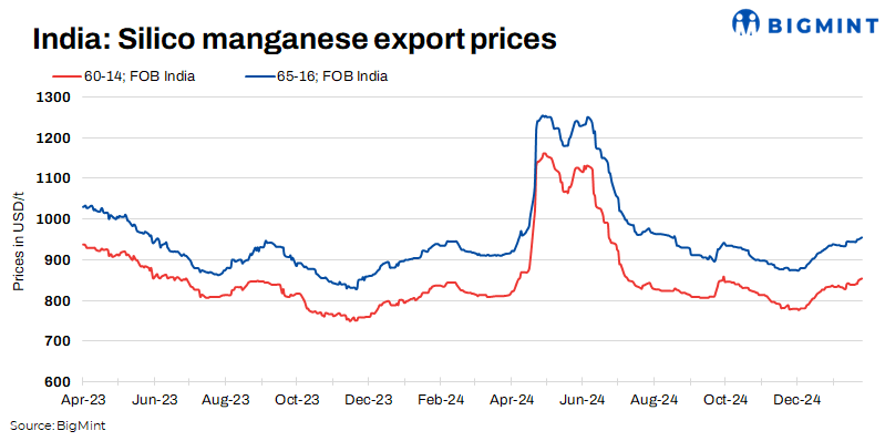 On the domestic front, MOIL, a key Indian ore producer, announced a price hike for manganese ore effective 1 February, 2025. Grades above 44% saw a 3.5% increase, while prices of grades below 44% were raised by 8.2% m-o-m. Additionally, prices for all SMGR (Mn 30%, Mn 25%, and Mn 20%) and fines grades were raised by 8.2%.