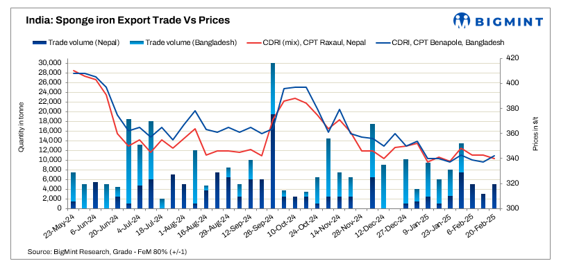 India’s sponge iron export offers displayed a mixed trend for Nepal and Bangladesh, with limited transactions at lower prices. Around 5,000 t were concluded for Nepal this week.