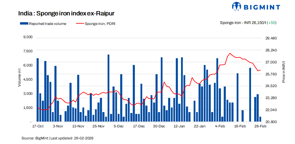 Indian sponge iron prices increased by INR 50-200/t across regions on 26 February. Despite the price rise, buying activity remained muted, with limited enquiries reported across markets. As prices have been correcting continuously in recent sessions, buyers largely maintained a wait-and-watch approach, leading to cautious and need-based procurement.