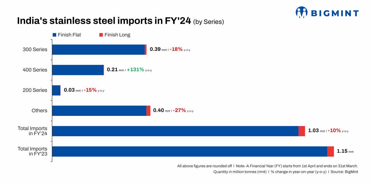 Data shows that imports of 300-series stainless steel products stood at over 385,000 t, a decrease of around 18% y-o-y, while imports of other series were over 400,000 t. Incidentally, imports of 400 series products, basically martensitic stainless steels amenable to further heat hardening, increased sharply y-o-y to over 210,000 t even as inbound shipments of 200 series products declined by 15% y-o-y to around 34,000 t.