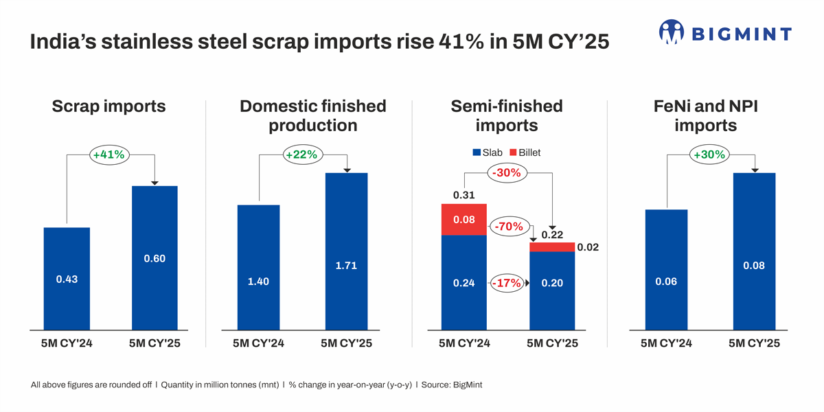 Morning Brief: India’s stainless steel sector witnessed a remarkable surge in scrap imports during the first five months of calendar year 2025 (5MCY’25). As per BigMint data, total stainless steel scrap imports reached 0.602 million tonnes (mnt), marking a sharp 41% increase compared to 0.426 mnt in the corresponding period last year.