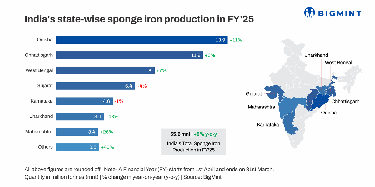 Domestic sponge iron production capacity has grown manifold over the last few years, with production reaching around 55-56 mnt in FY25. Capacity is estimated at around 68-70 mnt. The share of coal-based sponge iron production in India is over 80%.