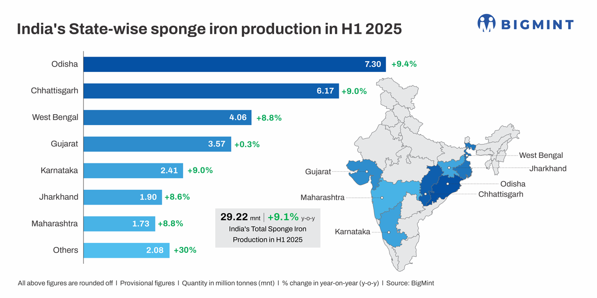 India witnessed modest upticks in both sponge iron and billet production, aligned with the steady growth in crude steel production. Sponge iron output was higher by 9% y-o-y in H1CY25, at 29 mnt.