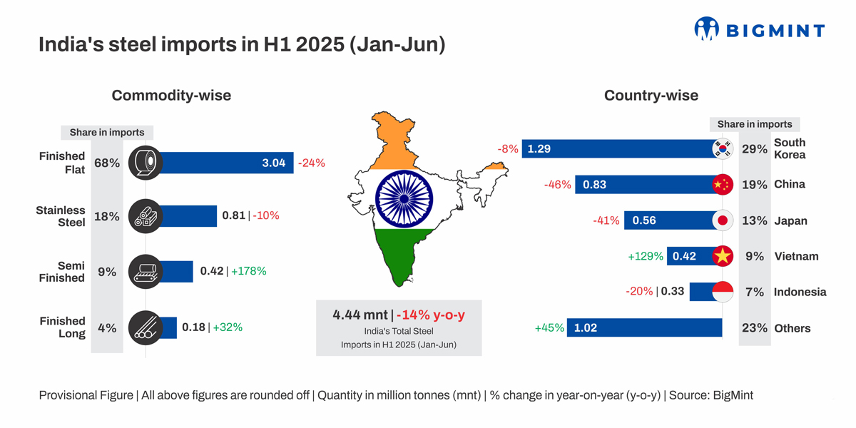 India’s steel imports fell 14% to 4.4 mnt against 5.2 mnt in the corresponding period last year. India remained a net importer during this period, with a trade deficit of 0.7 mnt compared to 0.3 mnt in H1 last year. China and Japan saw volumes contract by 46% and 41% y-o-y to 0.83 mnt and 0.56 mnt, respectively. However, South Korea recorded a modest 8% decrease to 1.29 mnt.