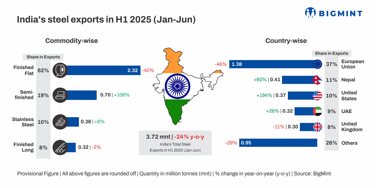 India’s steel exports were down by a deep 24% in H1CY’25 to 3.7 million tonnes (mnt) from 4.9 mnt in H1CY’24. Finished flats stood at 2.3 mnt in H1CY’25, falling by 40% y-o-y to a 62% share overall (77% in H1CY’24). Of the various sub-categories, shipments of HRCs and plates crashed by 68% y-o-y, to just 593,000 t. As a result, the share of HRCs/plates, which stood at around 50% of India’s total flats exports in both CY’23 and CY’24, dived to a mere 26% in H1CY’25.