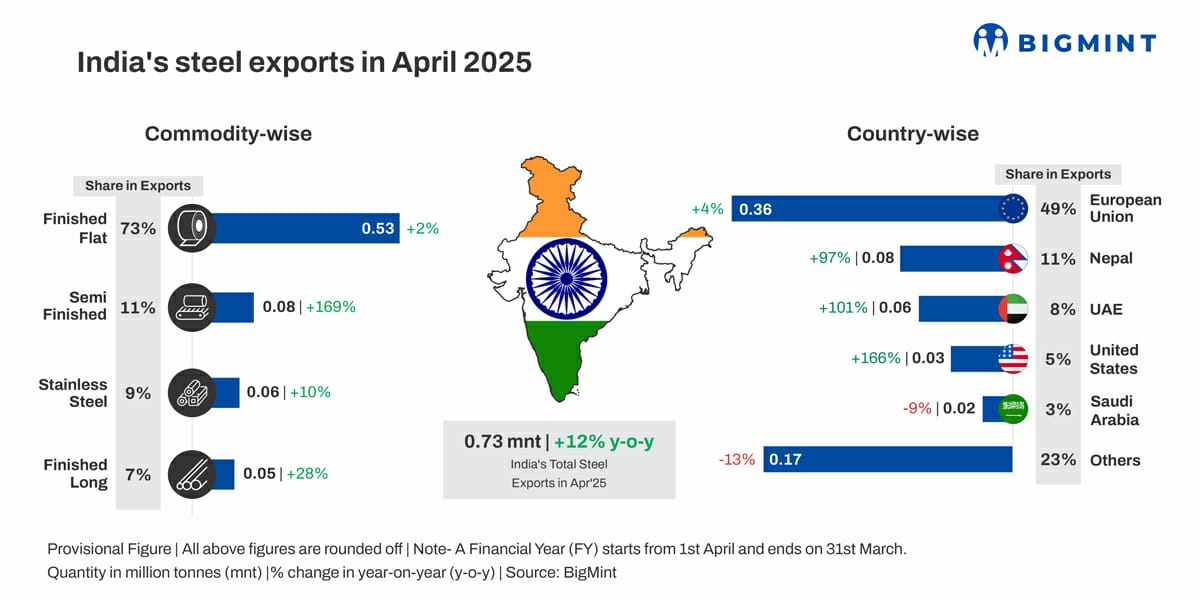 In April 2025, although shipments to the US and Saudi Arabia declined sharply m-o-m, overall volumes remained similar to last month, as exporters shifted their focus to the EU market, where fresh import quotas for Q2CY’25 set in. Consequently, the EU’s steel imports from India scaled to a 13-month high of 358,054 t.