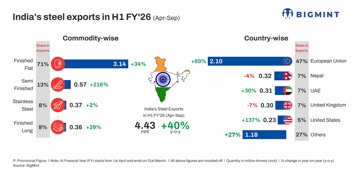 Morning Brief: India’s steel exports (including stainless steel) climbed up by 24% m-o-m to 1.07 million tonnes (mnt) in September 2025, the highest volume recorded since March 2024. In the past 18 months, this is the first time that exports have crossed the 1-mnt mark.