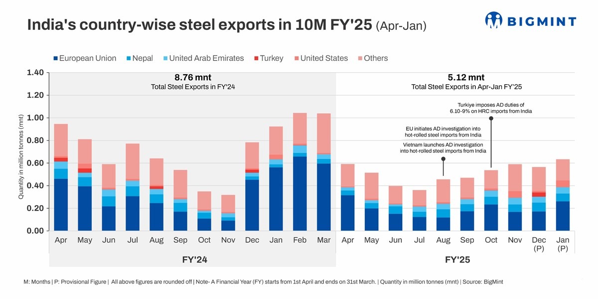 Morning Brief: India’s steel exports (excluding stainless steel) climbed up by 12% to 634,061 tonnes (t) in January 2025 compared to 565,292 t in December 2024, according to provisional data maintained with BigMint. Volumes stood at a nine-month high, with similar levels last seen in April 2024.