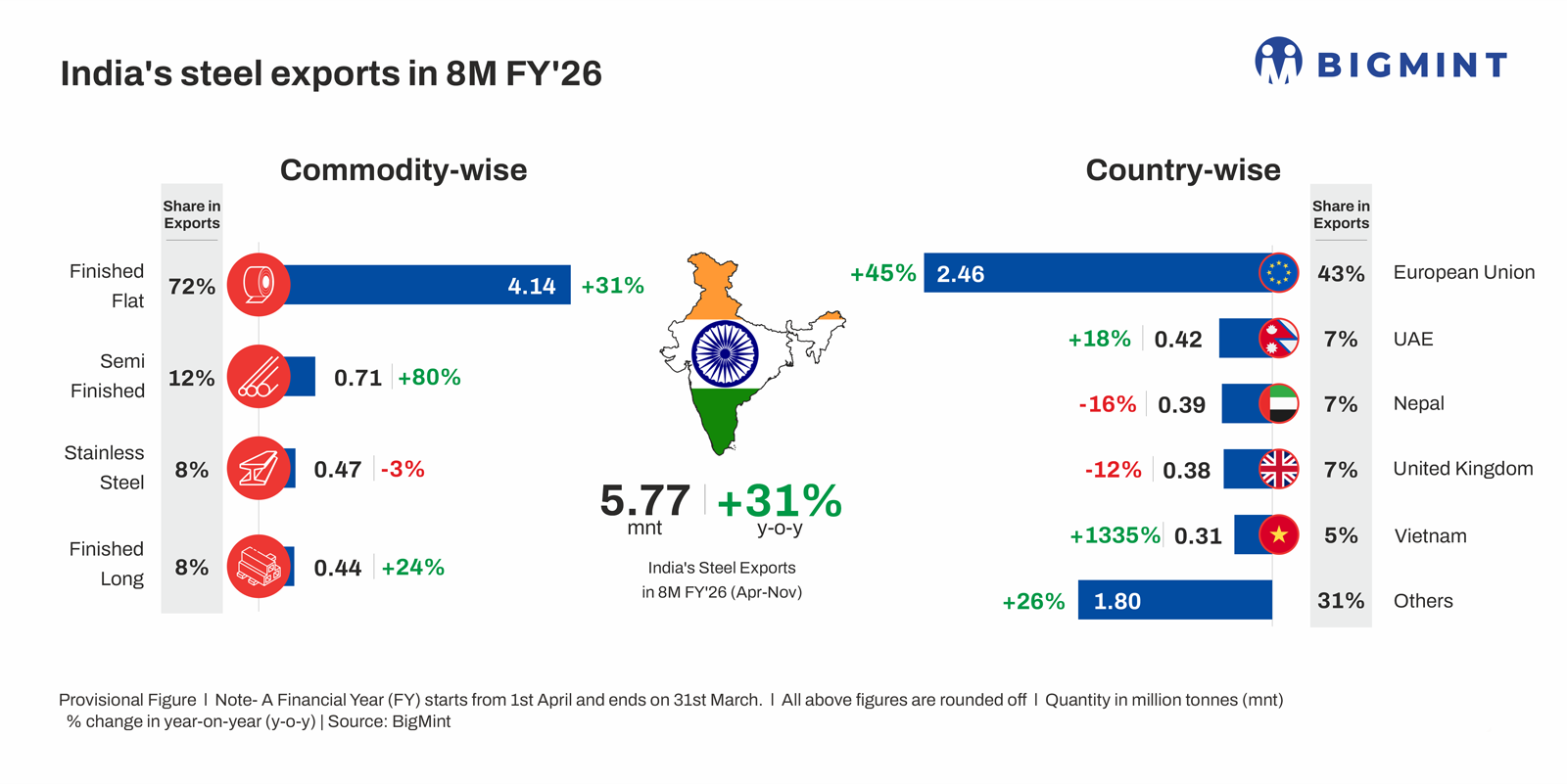 Morning Brief: India’s steel exports (including stainless steel) climbed up by a strong 31% y-o-y to 5.77 million tonnes (mnt) in April-November 2025 (8MFY’26), as per provisional data maintained by BigMint. Pre-emptive restocking by EU-based buyers was the primary trigger, with cost concerns emerging ahead of the phase-in of Carbon Border Adjustment Mechanism (CBAM) from 1 January 2026.