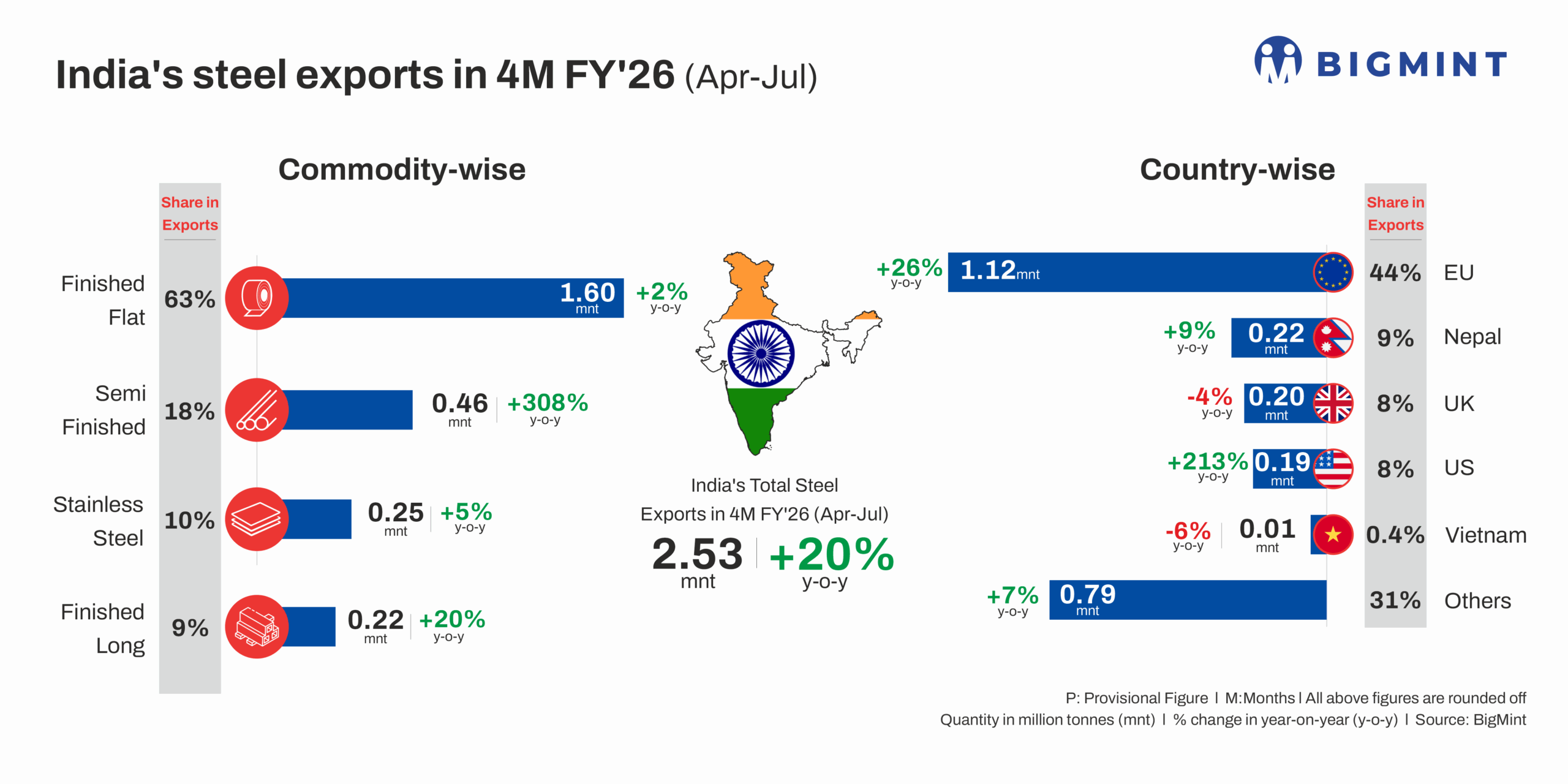 India steel exports (including stainless steel) grew 20% y-o-y in the first four months of FY’26 (4MFY’26) to 2.53 million tonnes (mnt), as per data compiled by BigMint. This provides concrete signals of a recovery in India’s export momentum, which has been lagging in recent times due to mounting shipments from China, weakening global steel consumption, and unbeatable pricing from competitors.