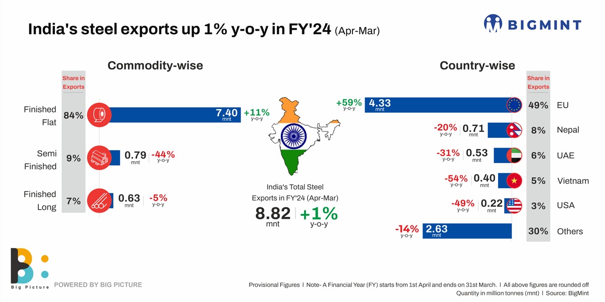 India’s steel exports were a bit of a no-show in financial year 2023-24 (FY’24). Volumes rose a marginal 1% to 8.82 million tonnes (mnt) against 8.75 mnt in FY’23, reveals data maintained with BigMint. Finished flats, which traditionally comprise the major portion of exports, hogged the limelight in FY’24 as well at 7.40 mnt, up 11% against 6.69 mnt in FY23. Flats had an overwhelming 84% share in the total volumes exported last fiscal. Semi-finished (billets) dropped a steep 44% last fiscal to 0.79 mnt (1.40 mnt) while finished longs showed a minor 5% y-o-y drop to 0.63 mnt (0.66 mnt). Semis comprised a mere 9% and finished longs 7% of the total of 8.82 mnt.