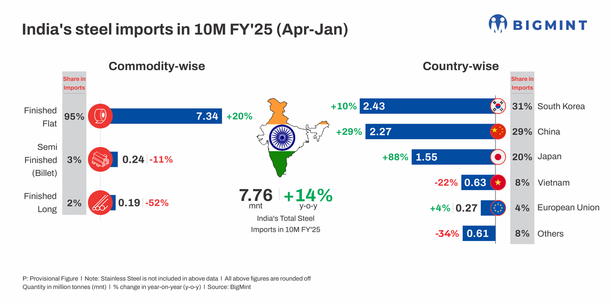 Notably, over 82% of total steel imports in January came from South Korea, Japan and China, comprising predominantly of flat products. In 10MFY’25, South Korea shipped around 2.43 mnt of steel to India, which comprise about 31% of total imports.