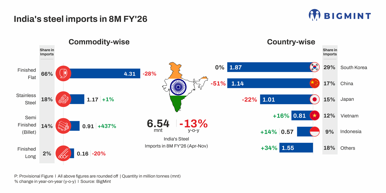 India’s finished flat carbon steel imports stood at 4.31 mnt in April-November, down 28% y-o-y. Hot-rolled coil (HRC) arrivals declined by 38% to 1.89 mnt, while electrical steel fell by 15% to 1.21 mnt and galvanised steel by 26% to 0.61 mnt.