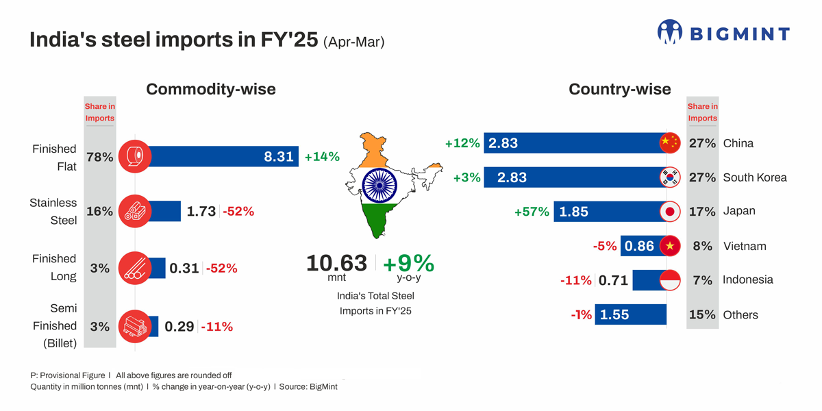 India’s steel imports (including stainless steel) totalled 10.63 million tonnes (mnt) in FY’25, up 9% from 9.75 mnt in FY’24, according to provisional data with BigMint. This is the highest volume recorded in nine years.