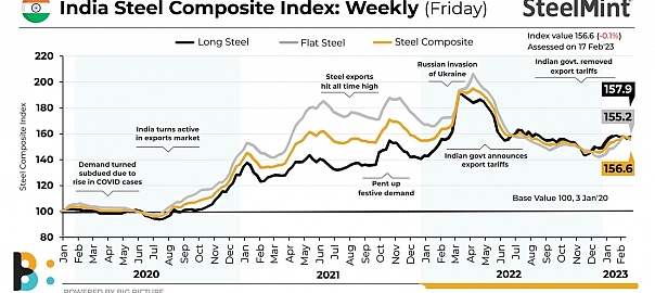 Morning Brief: The India Steel Composite Index remained stable w-o-w after two months of a fair amount of volatility. It closed down a negligible 0.1% for the week ending 18 February, 2023 at 156.60 points (156.70 points in the previous week).