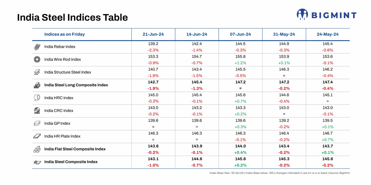The BigMint India Steel Composite Index dropped to a seven-week low last week. It has been hovering in negative territory for two consecutive weeks now and fell a further 1% to close the week ended 21 June, 2024 at 143.1 points (144).