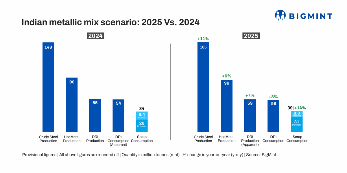 With capacity expansion progressing rapidly, sponge iron production and consumption are projected to continue rising in CY26. However, a sponge iron-heavy mix has negative implications for emissions and policy, so over the longer term, DRI is expected to yield ground to scrap, aligned with the governments sustainability agenda. Consequently, scraps share in Indias metallic mix will eventually surpass that of DRI.
