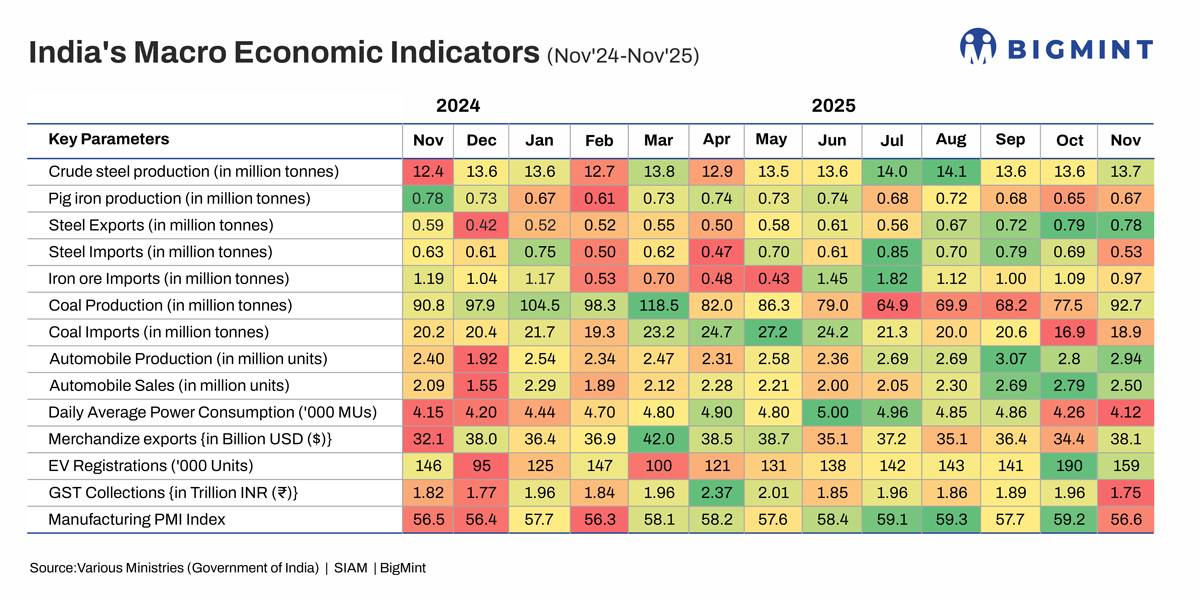 - Steel production remains above 13.5 mnt/month in late 2025
