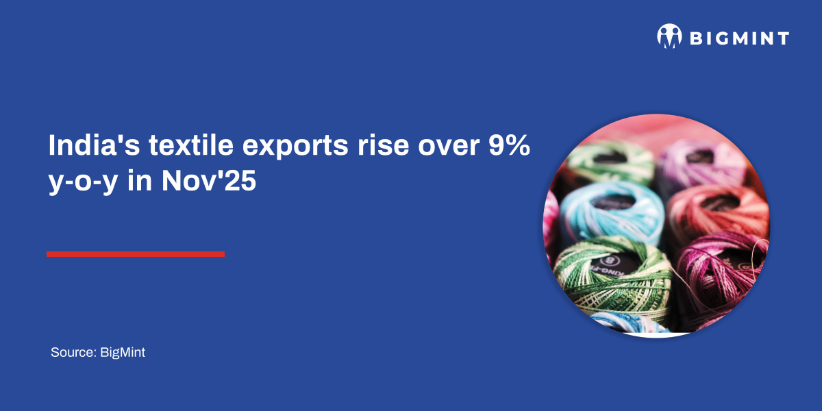India’s textile and apparel exports rose 9.4% y-o-y to ~$2.86 billion in Nov’25, recovering from a sharp 12.9% y-o-y fall in Oct (~$2.67 billion). Growth was led by ready-made garments and handicrafts, signalling demand stabilisation after US tariff-led disruptions.