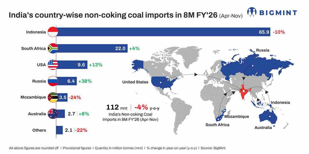 India’s thermal coal imports fell by 4% y-o-y to 112 million tonnes (mnt) in April-November 2025 (8MFY’26) from 117 mnt in the year-ago period, as per data maintained by BigMint. The decline can primarily be attributed to lower procurement of Indonesian non-coking coal (-10%), which is largely consumed by the power sector. The easy availability of domestic thermal coal at attractive prices has reduced the need for imports by power plants. The steady decline also aligns with the government’s drive to curtail India’s import dependency in the coal sector, as well as lift the usage of renewables.