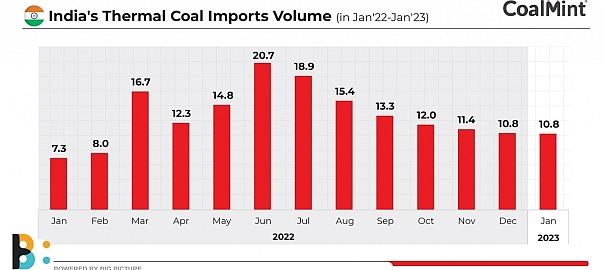India’s thermal coal imports in January 2023 remained stable at around 10.8 million tonnes (mnt), as per Coalmint data. However, imports increased sharply by nearly 50% y-o-y compared to 7.33 mnt in January last year.