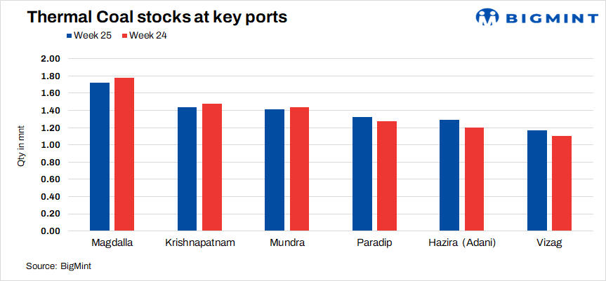JSW Steel experienced a significant decline in its thermal coal stocks during week 25, inched up marginally 0.45 mnt. Stocks held by Adani Enterprises remained largely stable at 5.4 mnt.