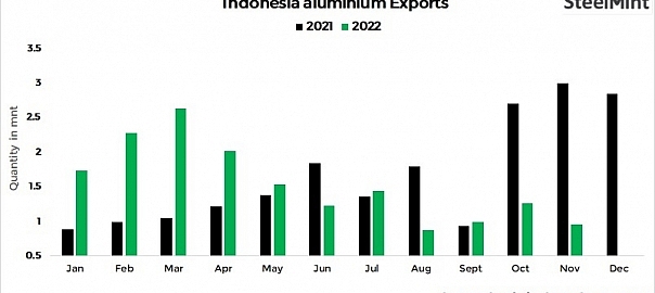 • On a y-o-y basis, aluminium ores/concentrates exports by Indonesia dropped by 68% from 2.99 mnt in Nov’21.