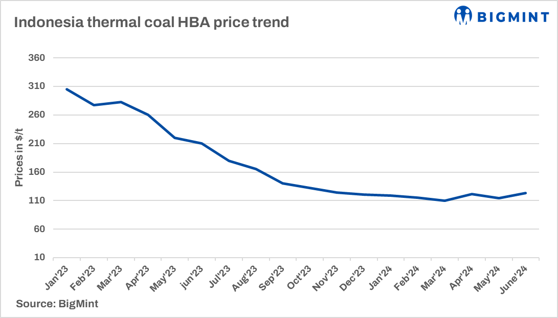 Indonesia’s benchmark coal prices, also known as Harga Batubara Acuan (6,322 kcal/kg GAR) increased by 8% m-o-m in June’24. The HBA prices in June’24 revised to $123/t. The prices for the 5,200 kcal/kg GAR grade were recorded at $88.95/t. The prices for 4,200 kcal/kg GAR and 3,400 kcal/kg GAR were recorded at $54.79/t and $35.82/t, respectively.
