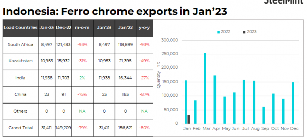 - Meanwhile, Indonesia’s ferro chrome imports fell by 80% in Jan’23 y-o-y against 156,621 t in Dec’22.