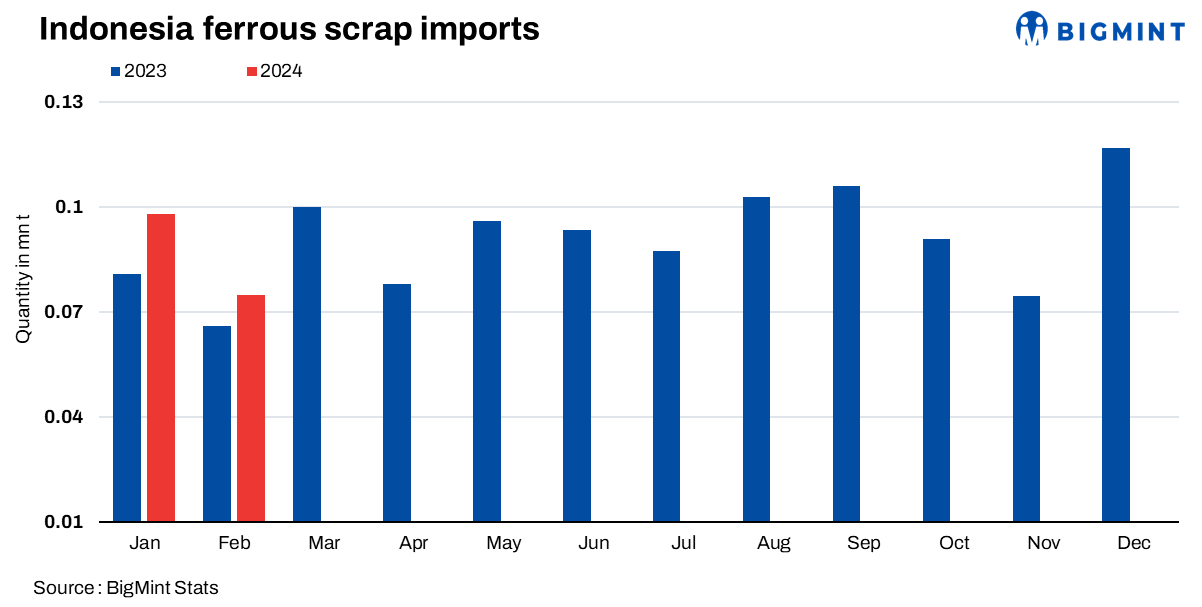 - Indonesia’s ferrous scrap imports stood at 74,854 t in Feb’24, down 24% in comparison with 98,937 t in Jan.