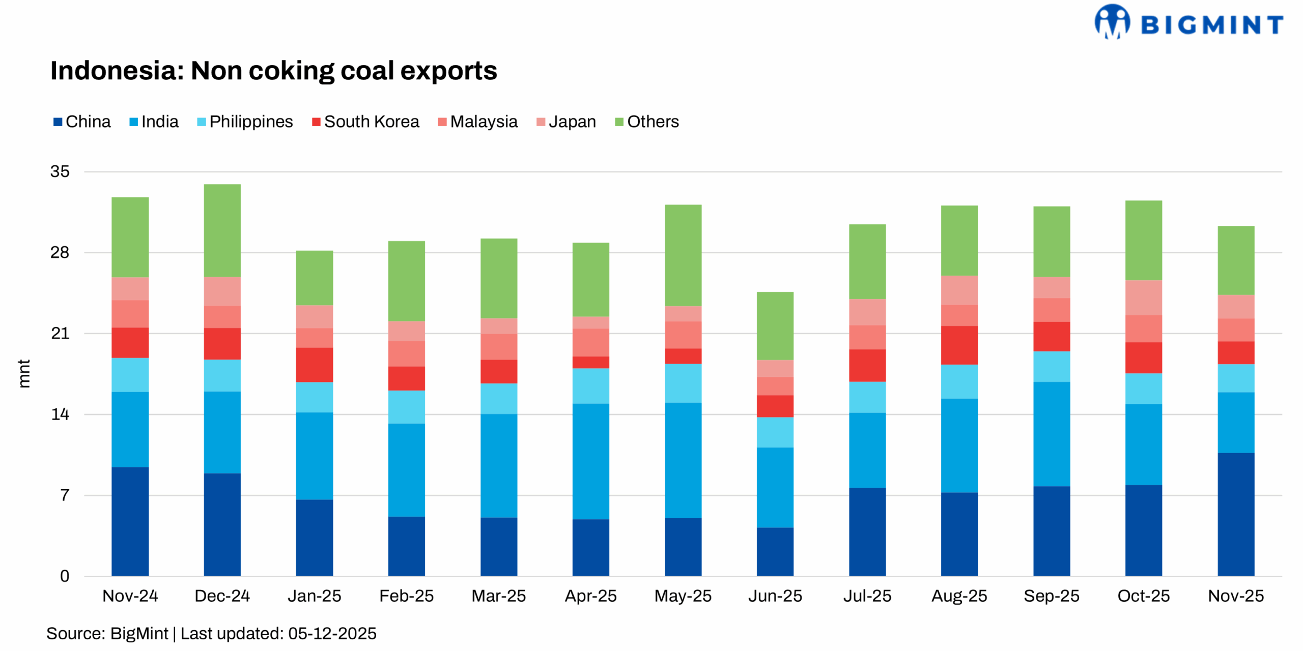 Indonesia’s non-coking coal exports declined in November 2025, signalling a gradual cooling in global consumption. Shipments fell 6.8% m-o-m to 30.29 million tonnes (mnt), from 32.51 mnt in October. On a y-o-y basis, exports slipped 7.6%, reflecting subdued demand across major Asian markets.