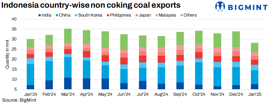 In January 2025, Indonesia’s non-coking coal exports saw a significant 17% m-o-m decline, dropping to 28.18 million tonnes (mnt) from 33.92 mnt in December 2024. This decrease was driven by a combination of fluctuating global demand, logistical challenges, and weather disruptions.