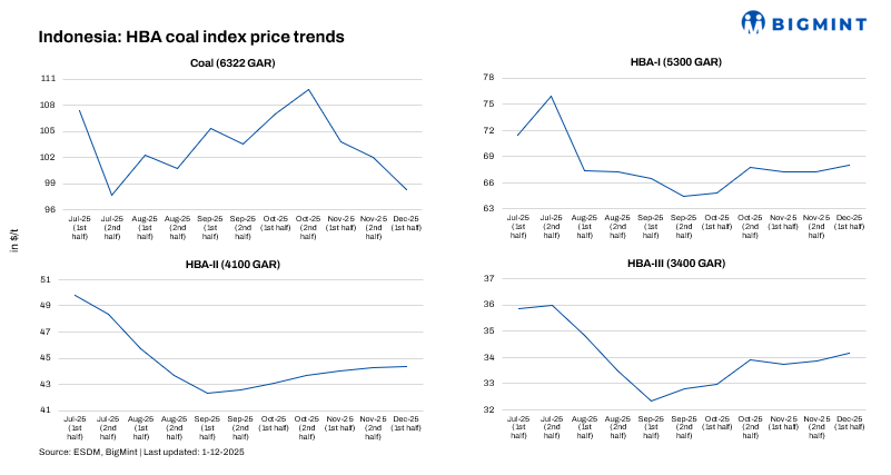 Prices of high-calorific value (6,322 kcal/kg GAR) thermal coal registered a steep 4% decline to $98.26/t, compared to the latter half of November. The correction was primarily driven by weaker import appetite from major Asian power utilities and increasing availability from Australian miners, which collectively pressured premium-grade pricing.